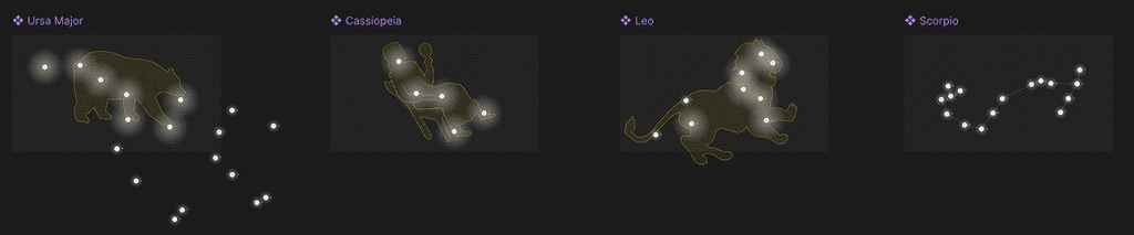 I started work on this project rather early, because when I started with this idea, I had no idea how to make a connect-the-dots experience inside of RIVE. I ended up switching between Booleans and Triggers quite a few times, to test which one was best for what I needed. I ended up using Booleans, which allowed me to make necessary checks across multiple State Managements. Learning how to use Bones was also crucial, as it allowed me to manipulate the different stars however I wanted, but still keep the paths intact. This made reproducibility for other constellations incredibly easy.
