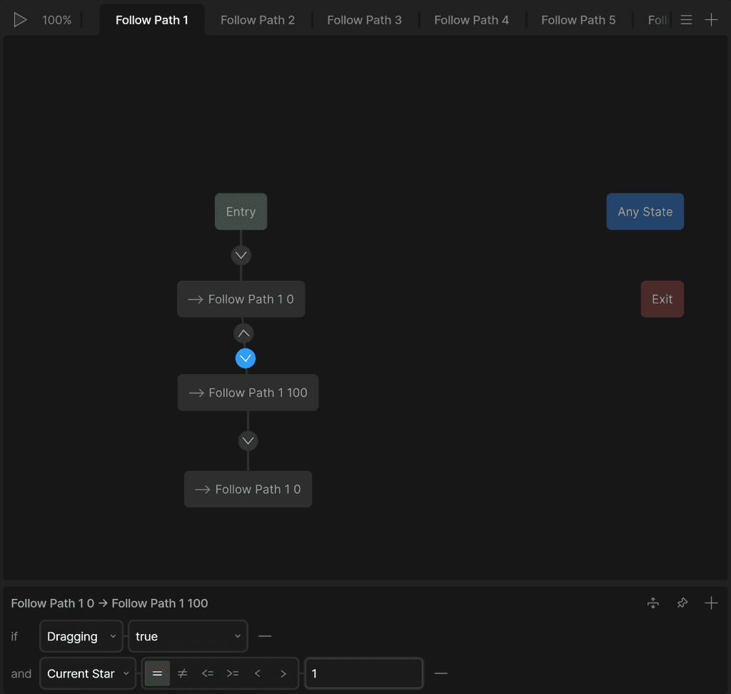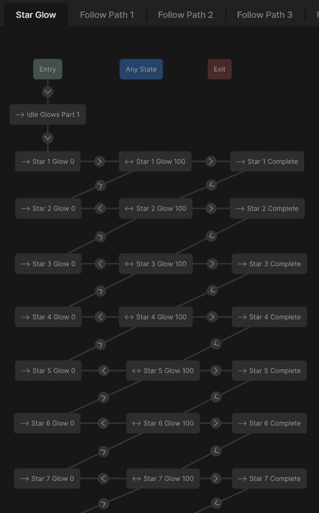 If the star is equal to the current star, the star goes into its idle glow state (Star X Glow 100). Once the user starts dragging from the star, the star completes its glow, and the next star begins its idle glow state. However, if the user lets go of the handle before they reach the next star, that star goes back to not glowing (Star X Glow 0), and returns to the previous star's glowing state.