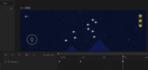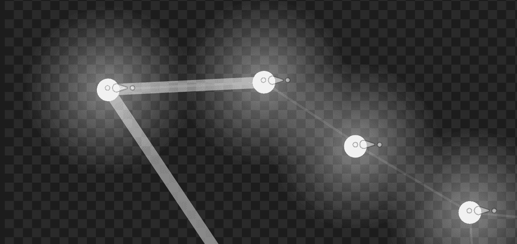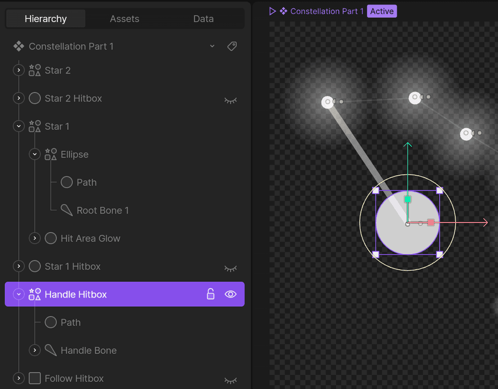 To connect all of the stars, I used bones on each star. These either connected one star to another, or connected a path from one star to my Handle Hitbox, which follows the user's cursor. This allows for the illusion that there is a preview path available to the user to show where they are dragging from. This also allows me to manipulate the stars however I want, without it messing up the animation.