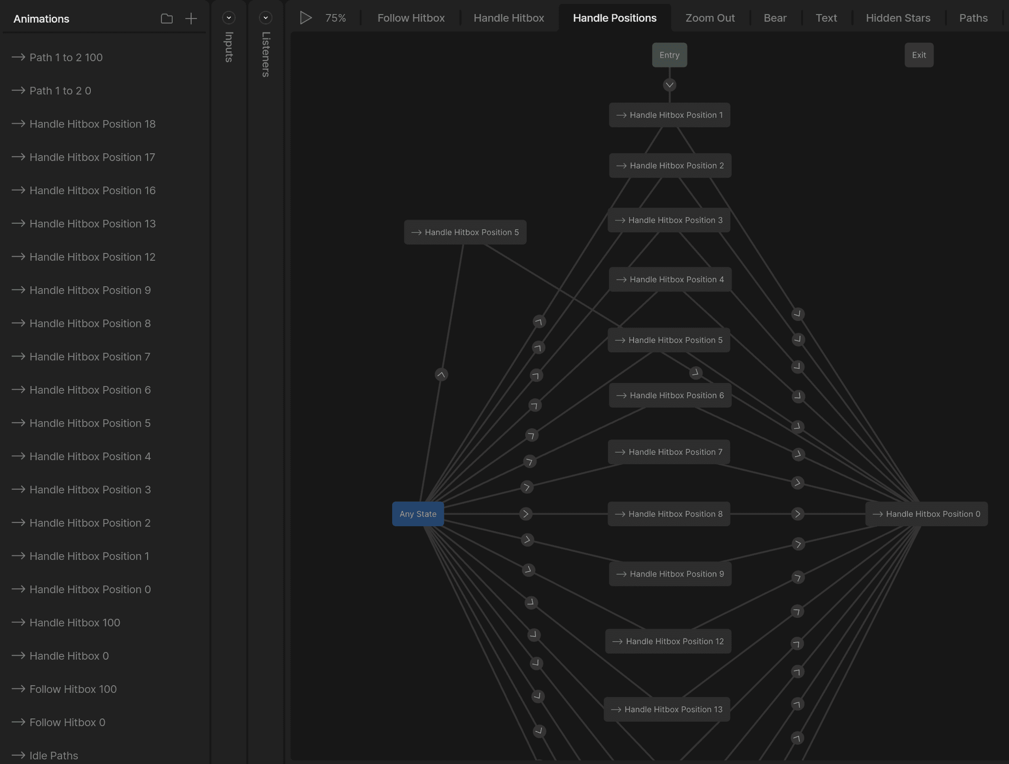 To make sure that the handle that user uses to control the path of the constellation stayed in its correct place, as well as snapped back into the most recent position if the user lets go, I had to do quite a bit of Timelines and State Management to make the user experience as smooth as possible. This required me to map out the exact positions that the handle could be at, and then set that in a large State Management Layer. However, this wasn't as simple as it seems. Since multiple stars can be visited multiple times depending on the constellation, multiple variables such as numbers and booleans were used to check the current star.