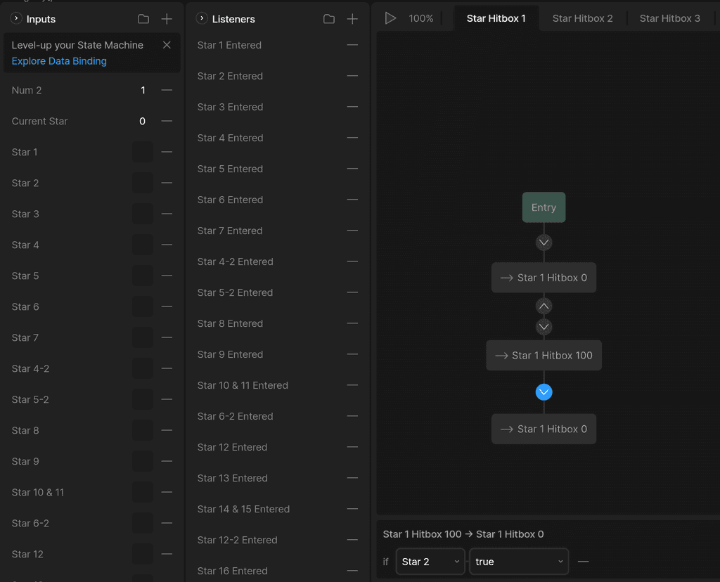 To ensure that the user went in the correct order, I implored two strategies, one that I will cover later in 'Star Glows'. The first, was completely necessary, and handled the physical hitboxes of the stars. Each star needed a hitbox to ensure that when the pointer entered the hitbox (Listener), that star would be set to the current star, and a boolean checking whether the star was entered was marked true. However, I needed to disable the hitbox once the next star was complete, so indivudal State Management Layers were implemented to manage each star's hitbox.
