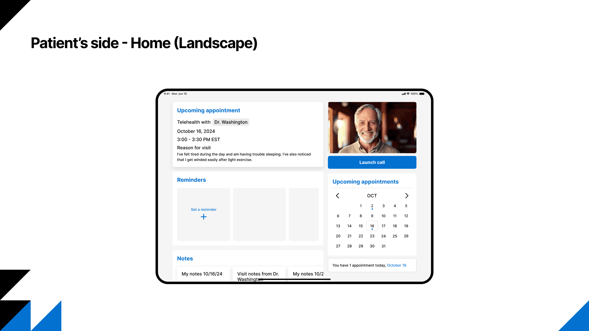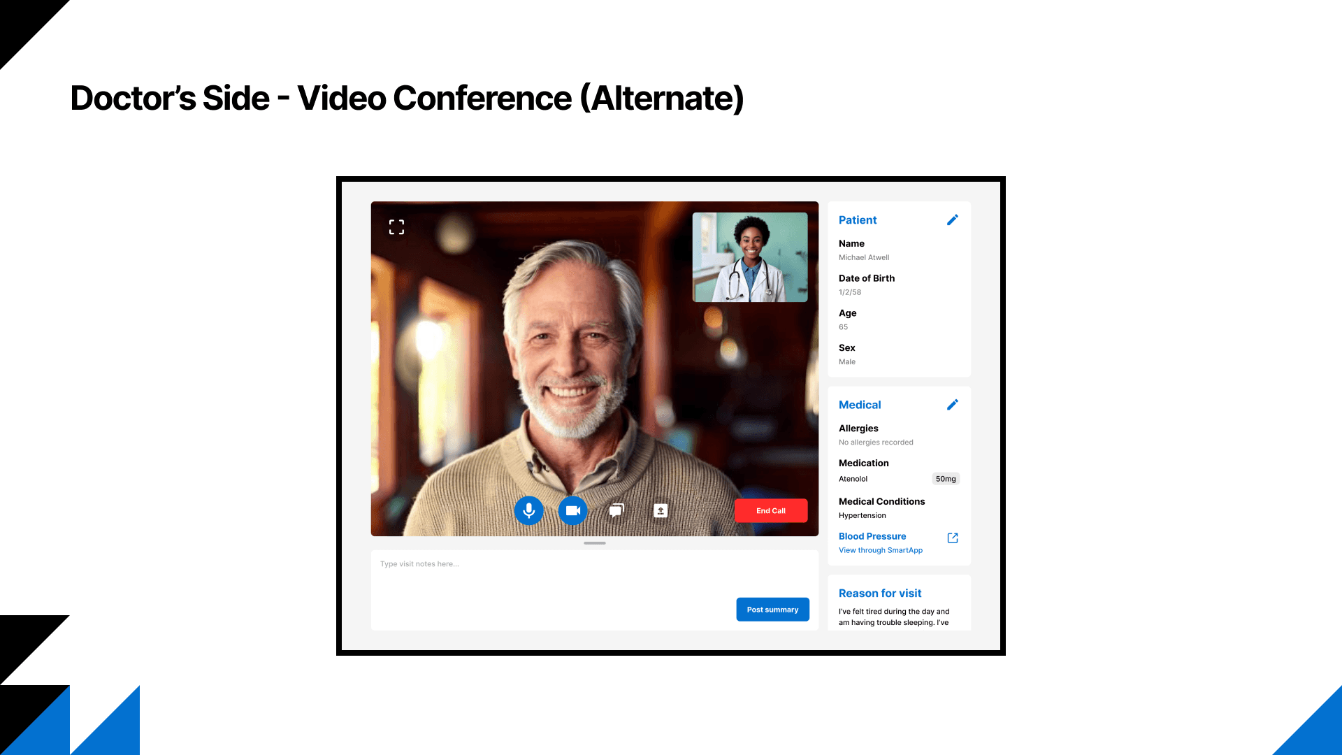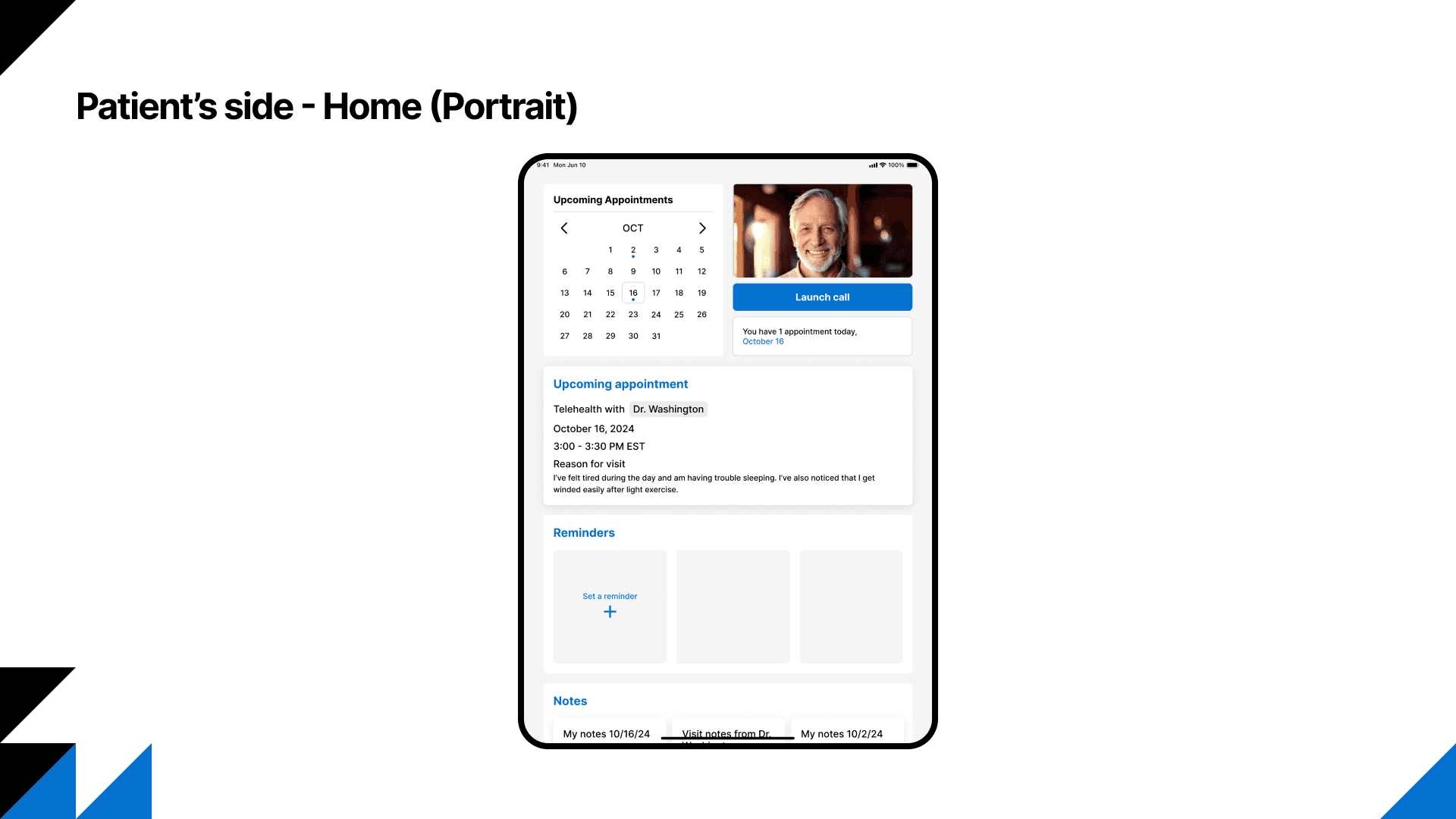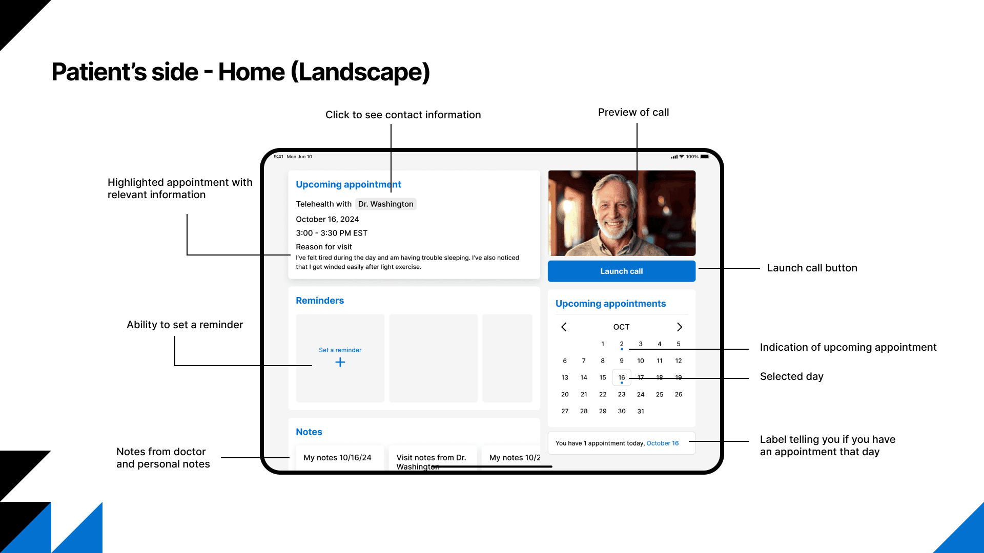 An assignment for an interview for Epic. The goal was to provide the interface for a video conference software that fulfilled a number of criteria, while also designing the doctor's (desktop) and patient's (tablet) sides.