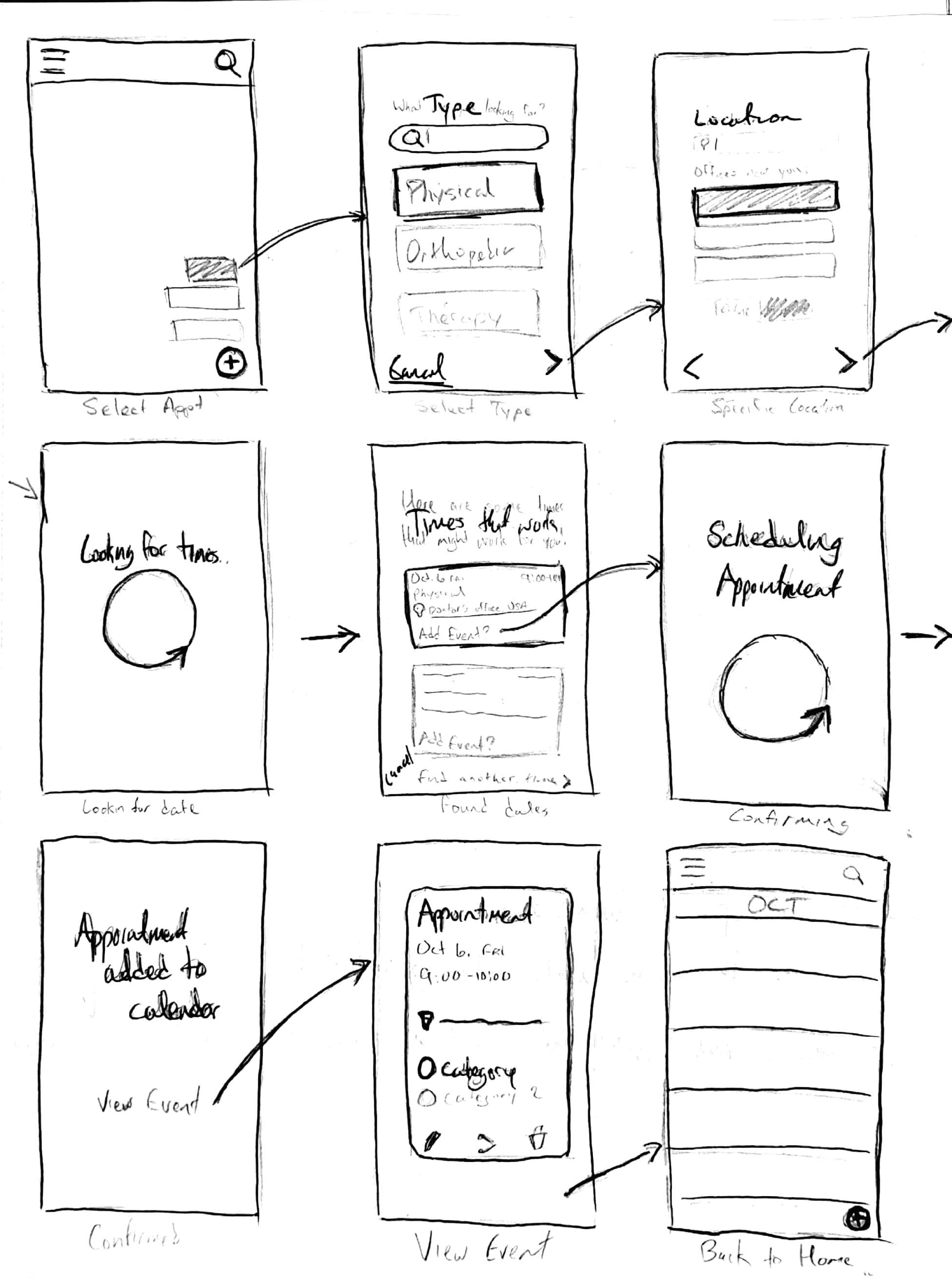 I spent some more time narrowing down the process, and finding the bare necessities between types of appointments. I also researched better ways for the interface to flow, as to have it flow more recognizably for users.